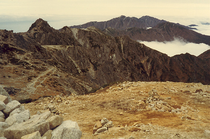 大分水嶺は北から来て北へ引き返していった。私は南から登って南へ引き返した。似ても似つかないアホみたいな話ではあるが、このときのことを思い出すにつけ、上のP点についての堀さんの文章「最高到達点あたりの砂礫の広い尾根は・・・」が生き生きと感じられるのである。