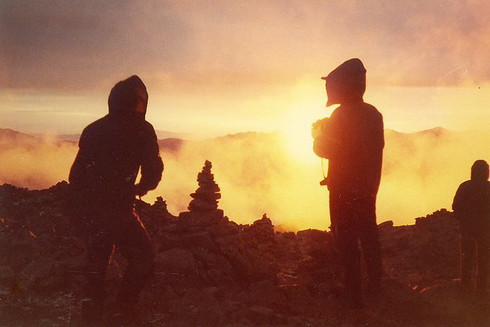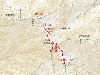 右がそのときのルートである。ケーブルの千畳敷駅から、千畳敷カールを横断して稜線のA点まで登る。そこから宝剣岳往復。岩がごつごつしていて結構楽しいところだった。A点へ戻って稜線を北へ。宝剣山荘・天狗荘を越えてちょっとしたピークについた。地図の中岳とあるところである。私はここを木曽駒の頂上だと思いこんだ。そしてそれを越えたところにある頂上小屋で一泊した。あくる日は風が強かったが、前日の中岳山頂で日の出を見た。