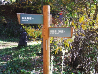 2.「奈良井宿へ」の標識。道は間違っていなかったらしい。ほっとする。写真を撮ったりしていたら、右の方から中年の女性のグループがやってきた。ざっと20人ほどだったろうか。その全員からジローっと睨まれた。それはそうだろう。自分たちがシンドイ思いをして、一歩一歩登ってきたところを、厚かましくクルマで来たやつがいる。何というヤツや。軽蔑から怒りのマナコまで、・・・いやいや、場違いなことをしました。ひたすら皆さんが通り過ぎるのを待つ。