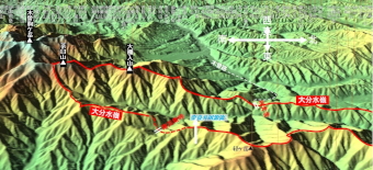 そこで、上の地図を90度左側へ倒し(西側を上として)、東側の天竜川流域の上空から俯瞰したのが右の立体図である。