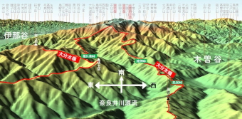 右のカシミール図は、左の地図の奈良井川源流の入り口、東西の幅がまだ広く「日本海流域」とある”日”の字の上空あたりを撮影ポイントとして、奈良井川源流を南に向いて見下ろしたところである。雑な言い方だが、左の奈良井川源流部の地図を、ぐるっと半回転、南北を逆にして、手前から見下ろしたところだと考えてもらえばいい。東に権兵衛峠、西に老神峠・鳥居峠があるが、南北方向が圧縮されているため前後関係がわかりにくい。