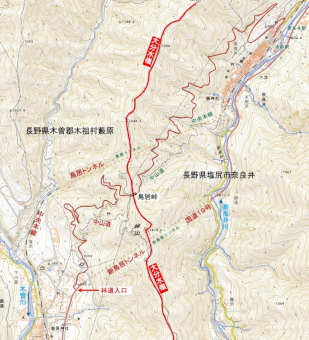 ”峠の向こうは晴れていた”というその”鳥居峠”、そこを走ったという話である。マラソンに出たのではない。朝、早発ち深夜帰宅を覚悟すれば日帰りで行けなくはないだろうが、常識的には1泊2日になりそう。なんだかだと気にはしつつ日が経つばかり。何で読んだのかは忘れたが、クルマで越える道があるという。藪原の方から国道19号新鳥居トンネル入り口の手前を左に折れたところ(地図下のほう「林道入口」としたところ)が登り口だと。情報はそれだけ。どんな道でどんな注意が必要かなど細かい情報は一切なし。ホンマに行けるのかいなと思ったが、こんなところでウソを書いても仕方なかろうと善意に解釈し、とにかく行ってみよう。2011年10月のことである。御トシ77歳。上述の”木曽駒近くまで登山”(1980)年から32年。この鳥居峠が”大分水嶺越え”であることはまだ知らない。